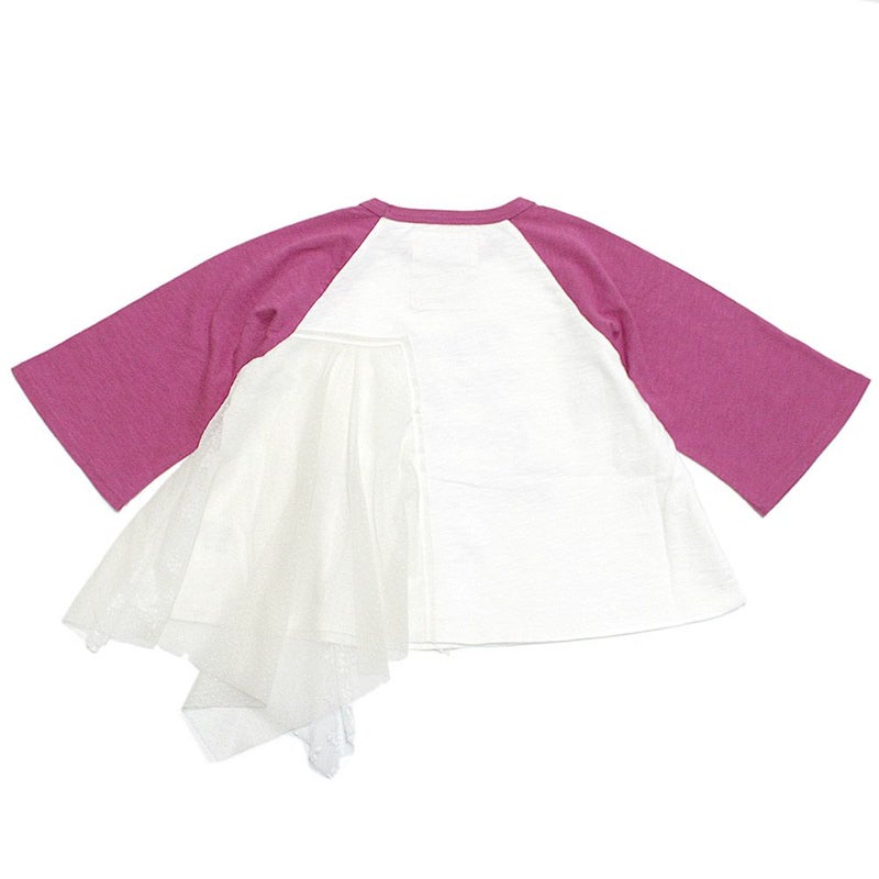 バンドTのようなプリントとラグラン配色が特徴。