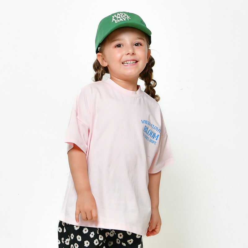 バックにフラワーのボックスプリントが入ったTシャツです。