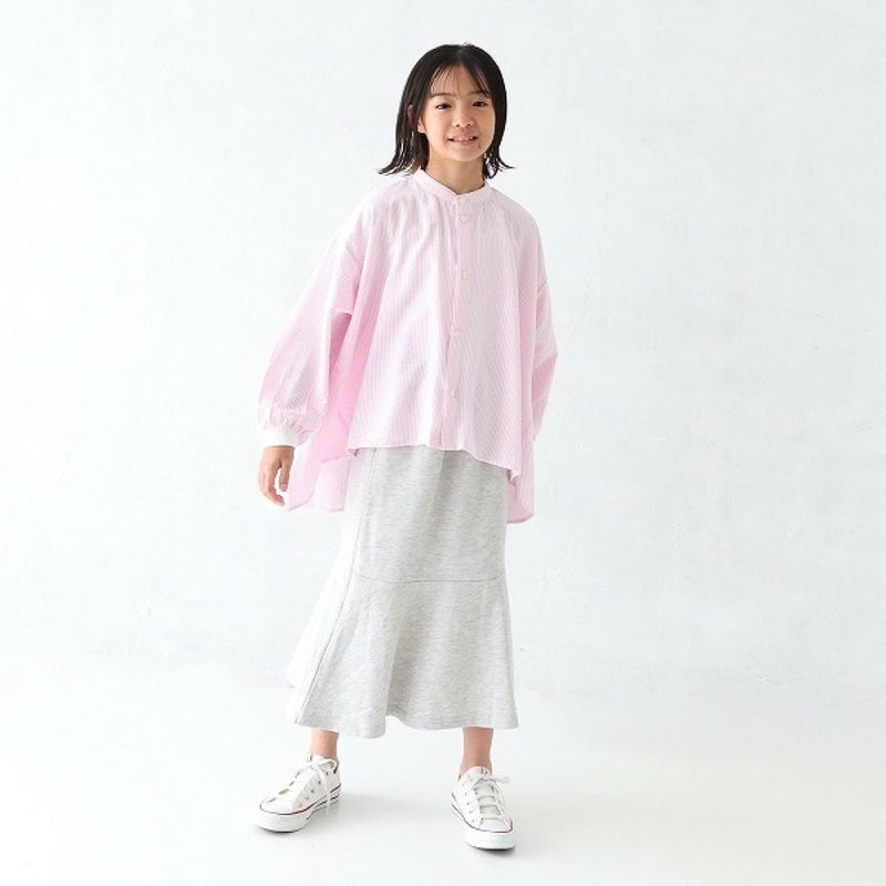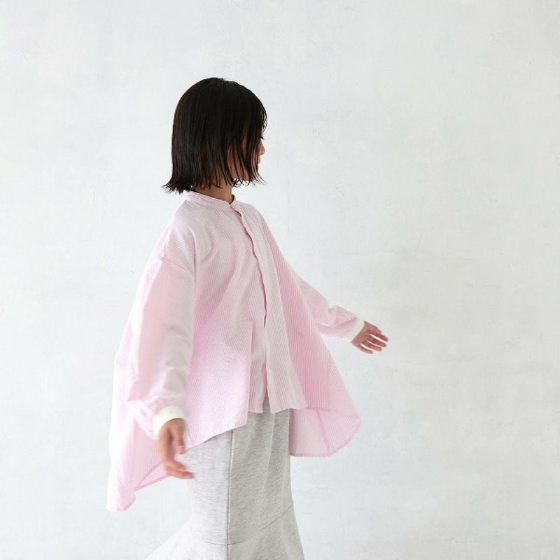 ふんわりしたフレアシルエットのストライプシャツ。