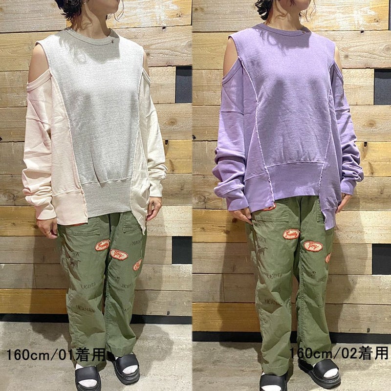 肩見せしたり、ノースリーブにして袖を結んだり、色々な着こなしができるオフショルスウェット。