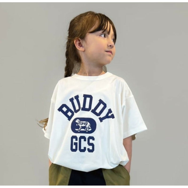 フロントにはブランドアイコンのスケボー犬(BUDDY)のカレッジタイププリントです。