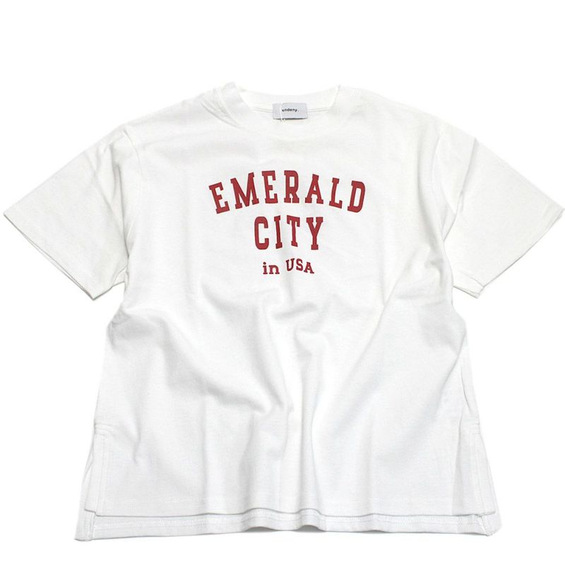 カレッジロゴが目を引くTシャツ。