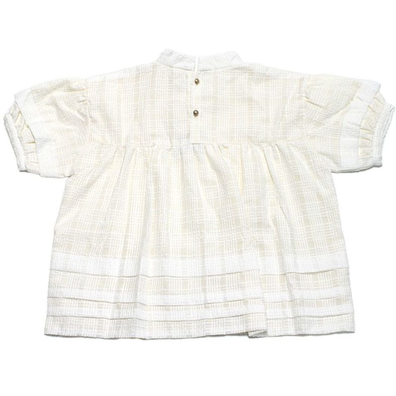 後ろ身頃にはギャザー、前身頃には生地を重ねて胸元にタックを施すなど、細かな部分に工夫を凝らした1着です。