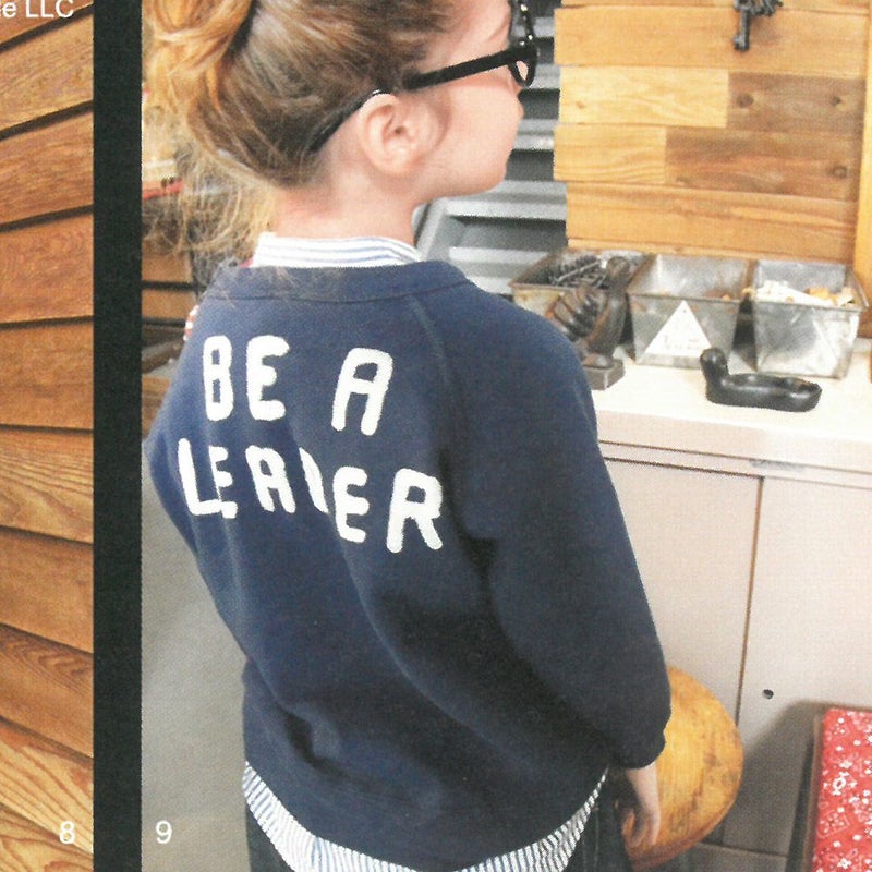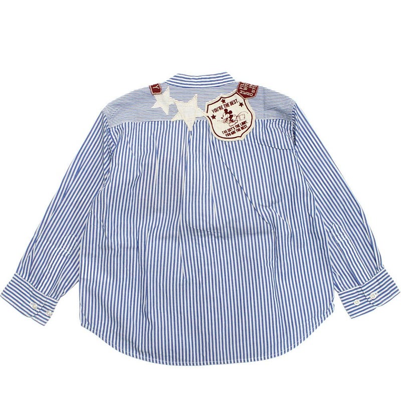 スタンドカラーのシンプルなシャツにミッキーや星のアップリケワッペンを襟元に施したリメイクデザイン。