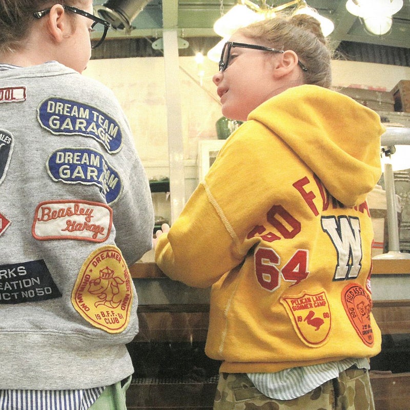 スタンドカラーのシンプルなシャツにミッキーや星のアップリケワッペンを襟元に施したリメイクデザイン。