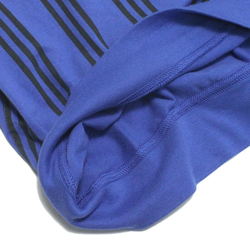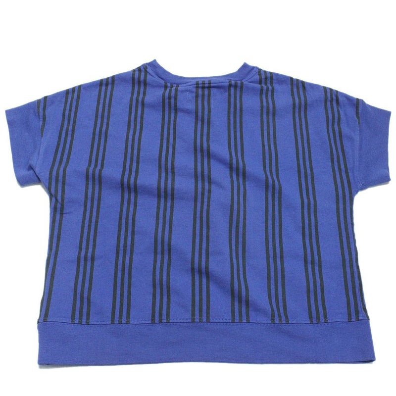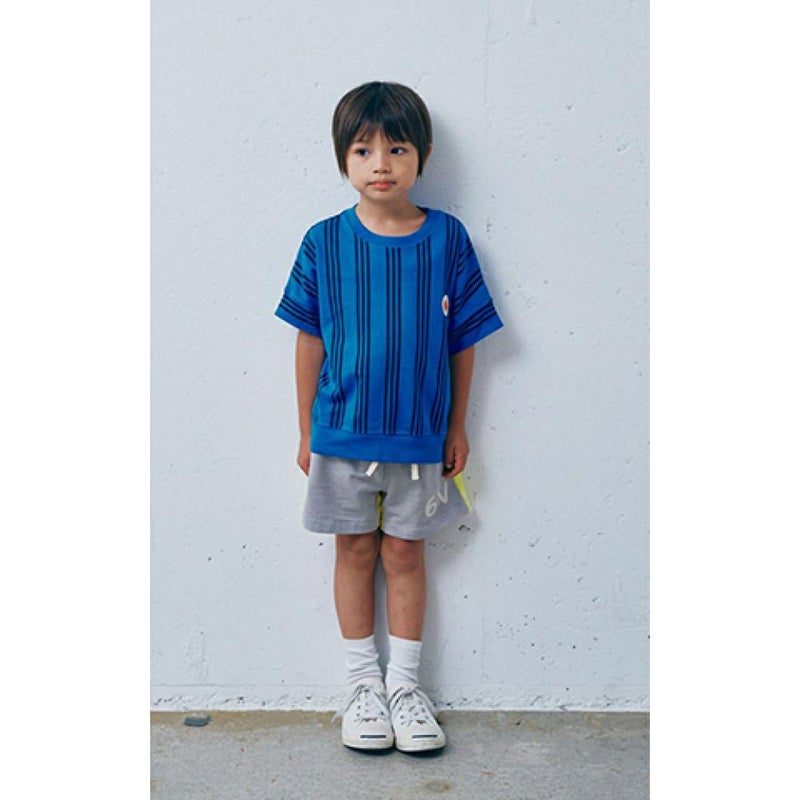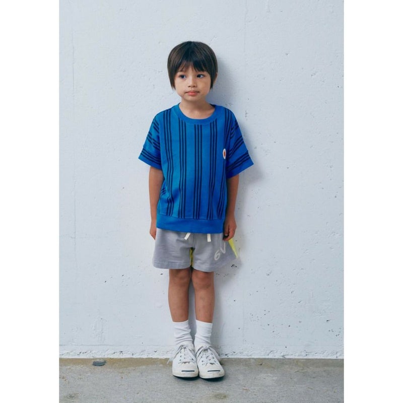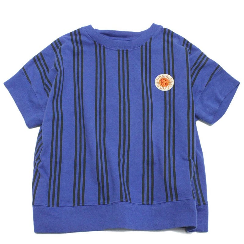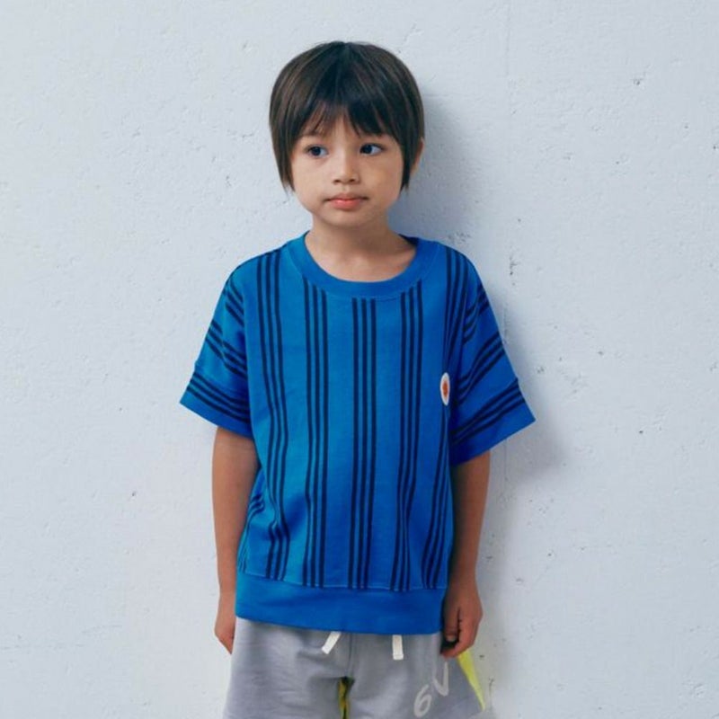 すっきりとしたストライプ柄に、胸元のワッペンがワンポイント。