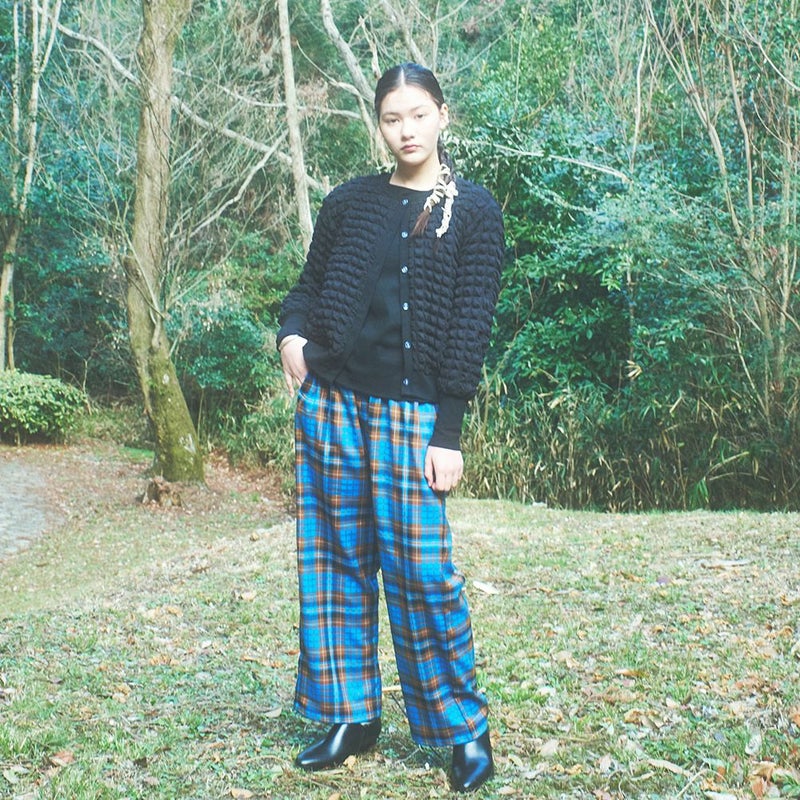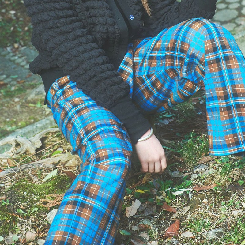 明るい配色が目を惹くチェック柄パンツ。