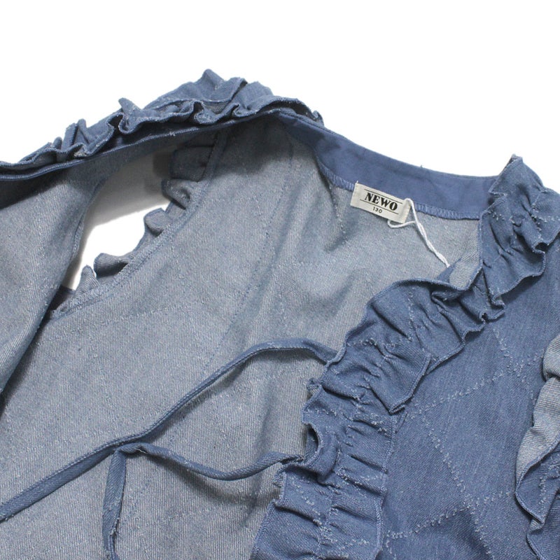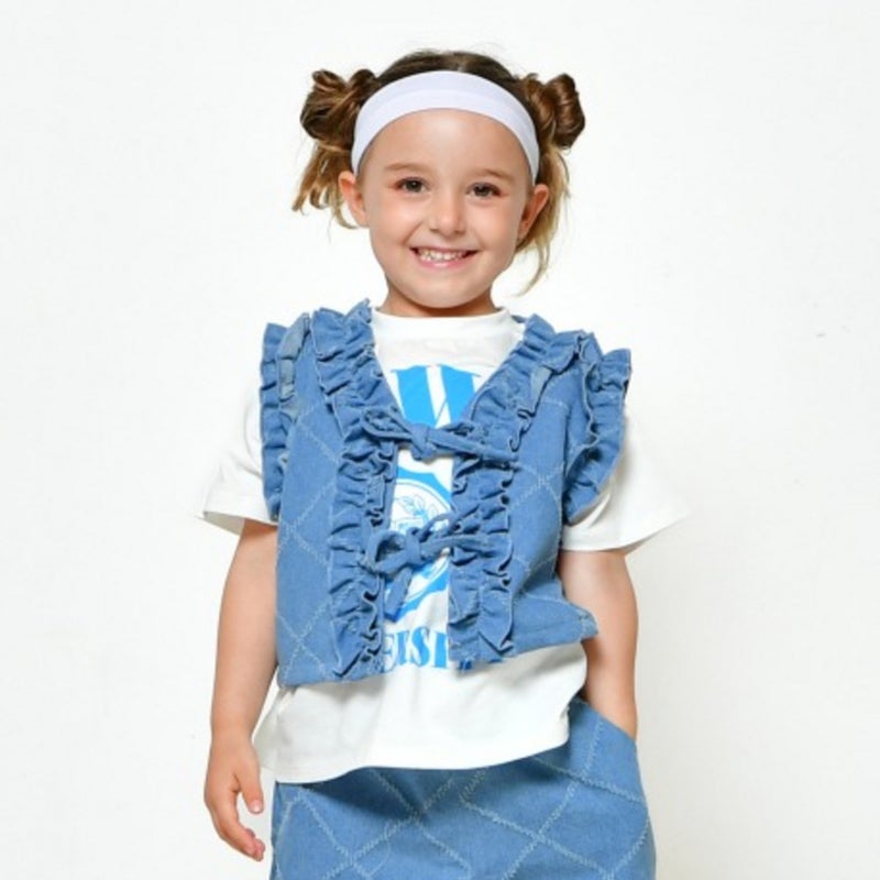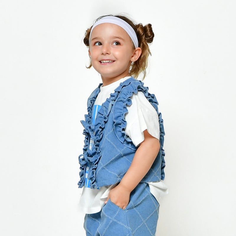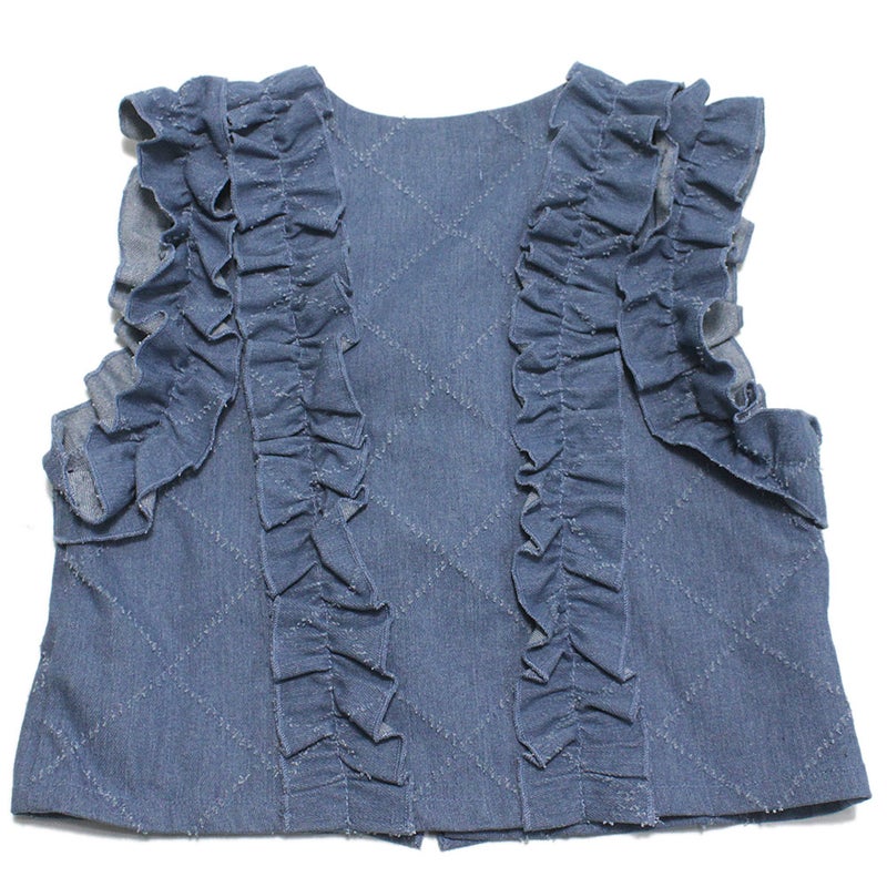 針抜きデニム生地が個性的なフリルベストです。