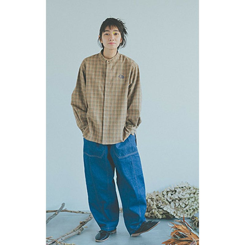 スタンドカラータイプのチェックシャツ。