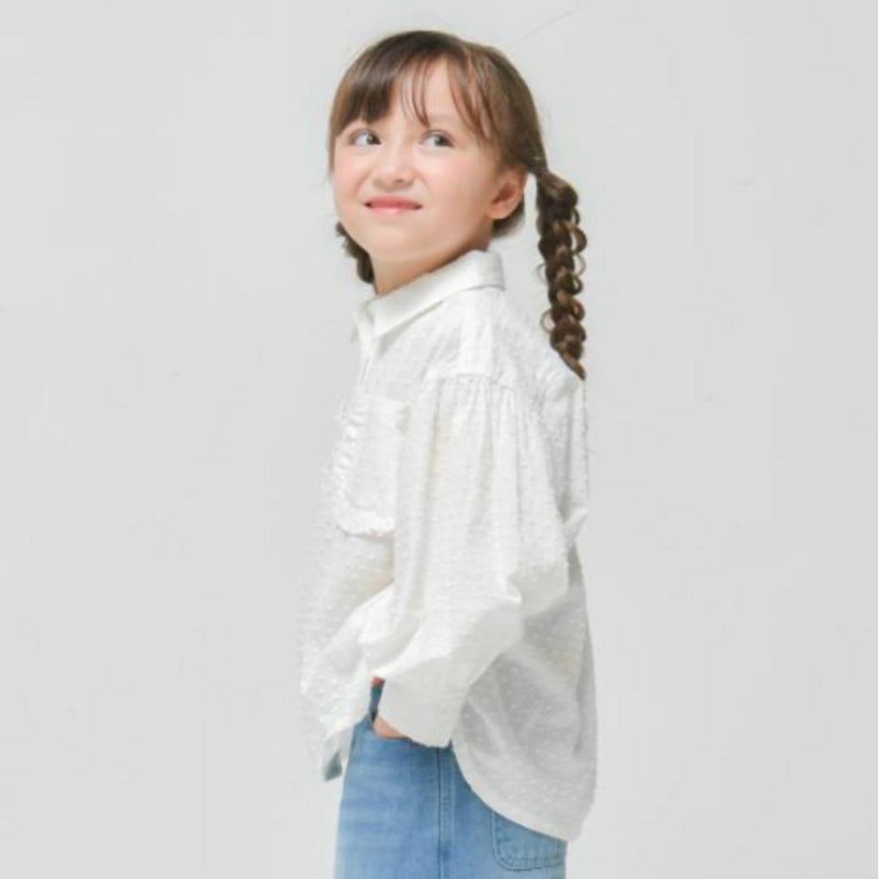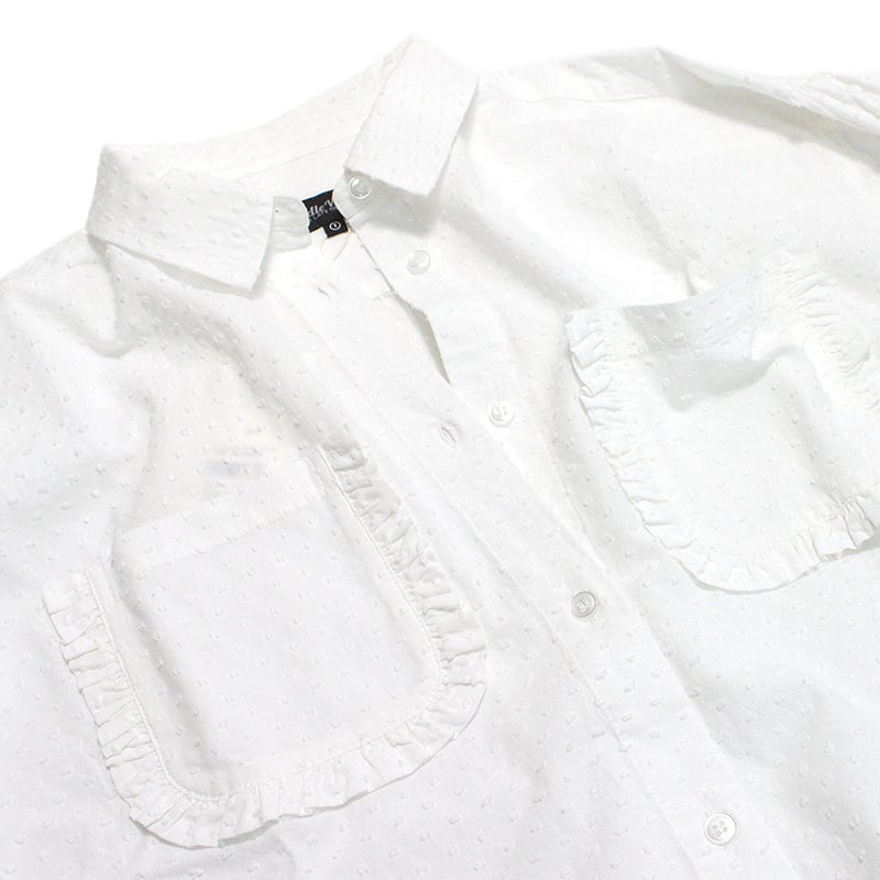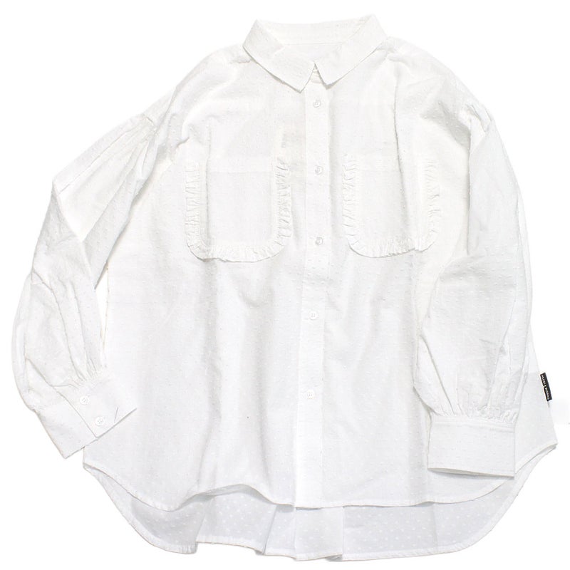 ポケットのフリルがガーリーな長袖ブラウス。