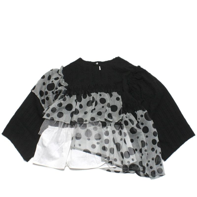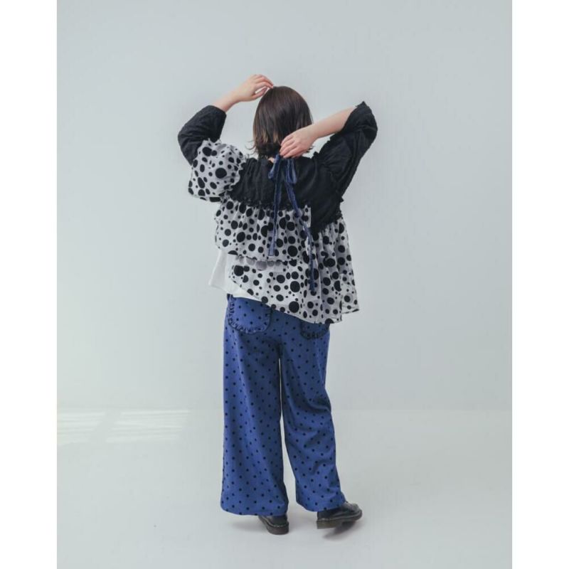 大きさの違うドットがランダムに配置された、ポップな模様が目を引くブラウス。