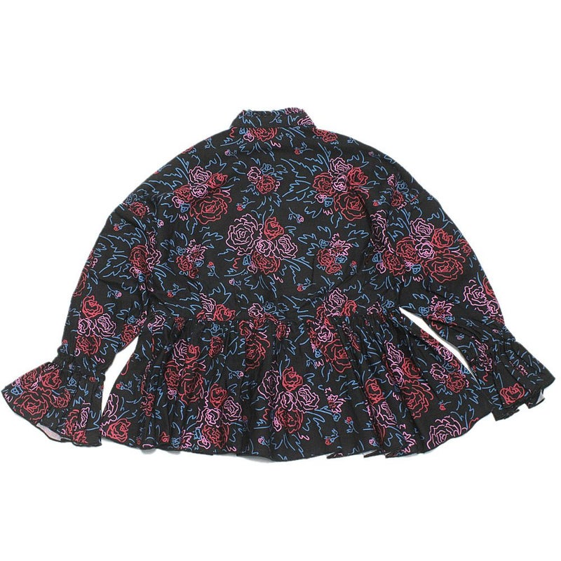 ウエスト部分にたっぷり取ったギャザーがひらひらと広がる、前開きの長袖ブラウスです。