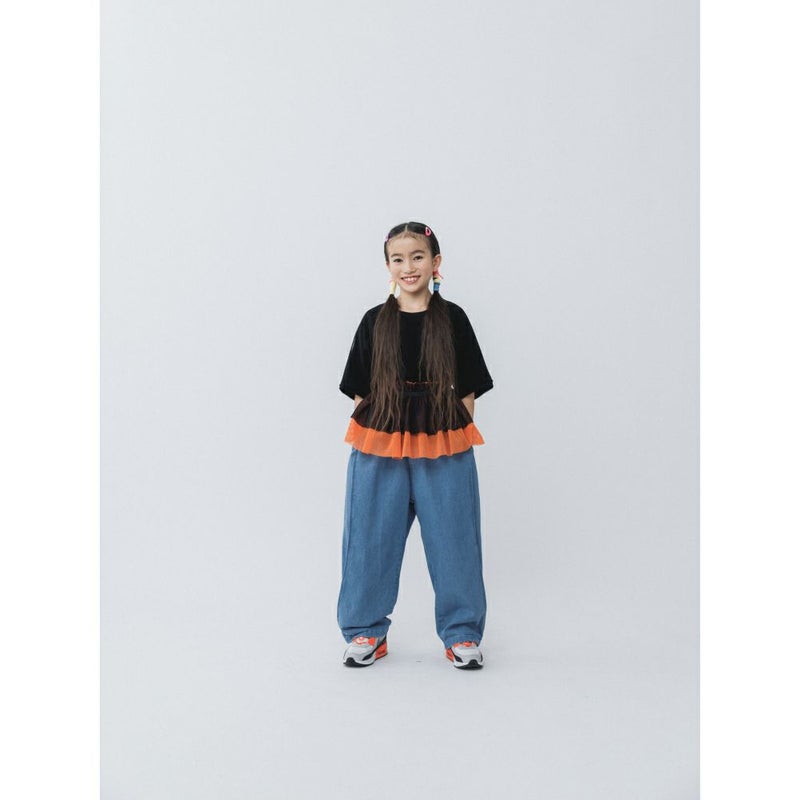 メッシュの様な雰囲気のチュールをレイヤードしたTシャツです。