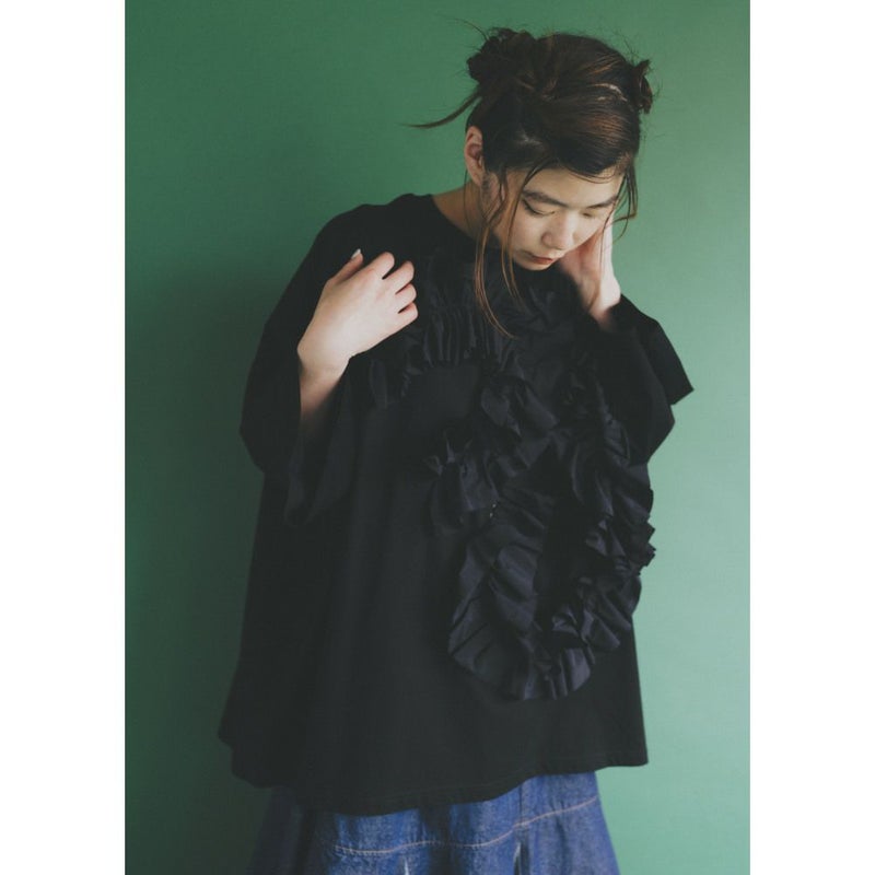 フリルを前身頃にふんだんに取り入れたTシャツです。